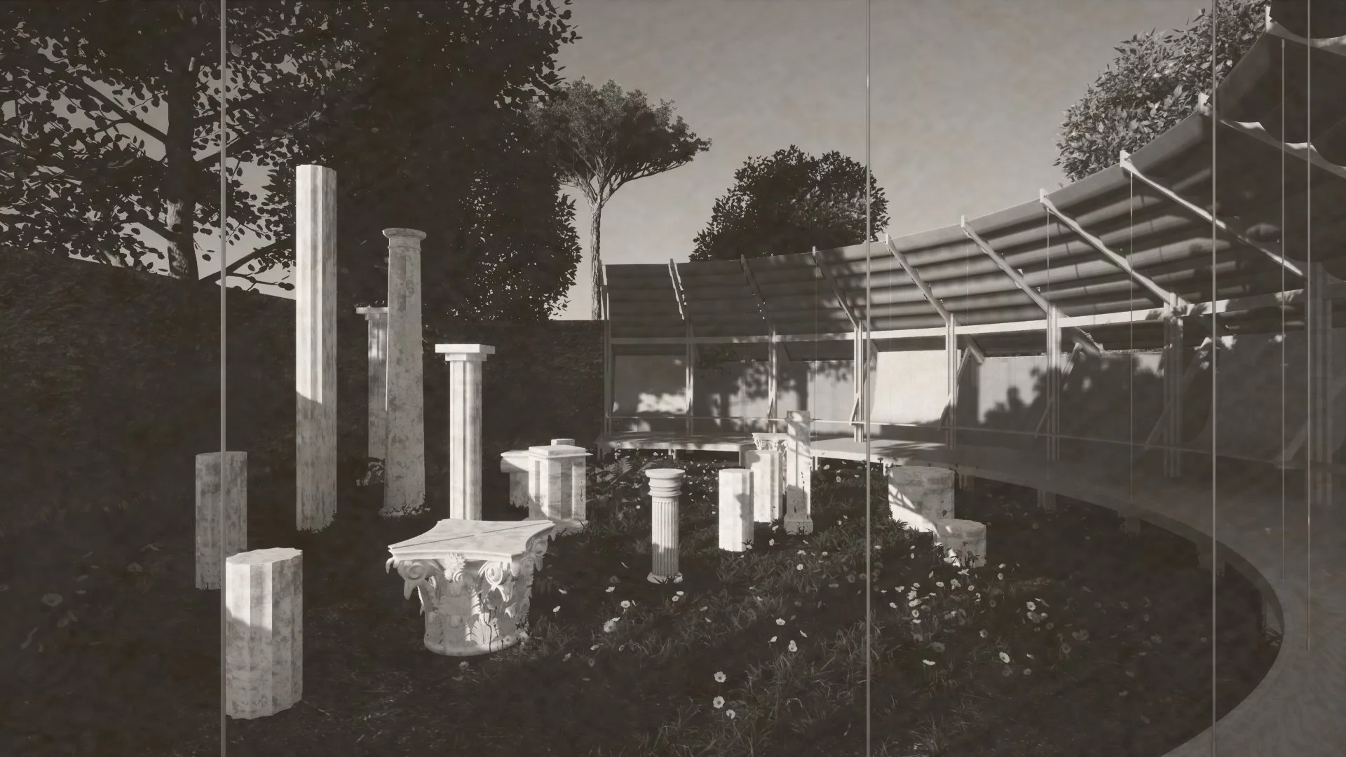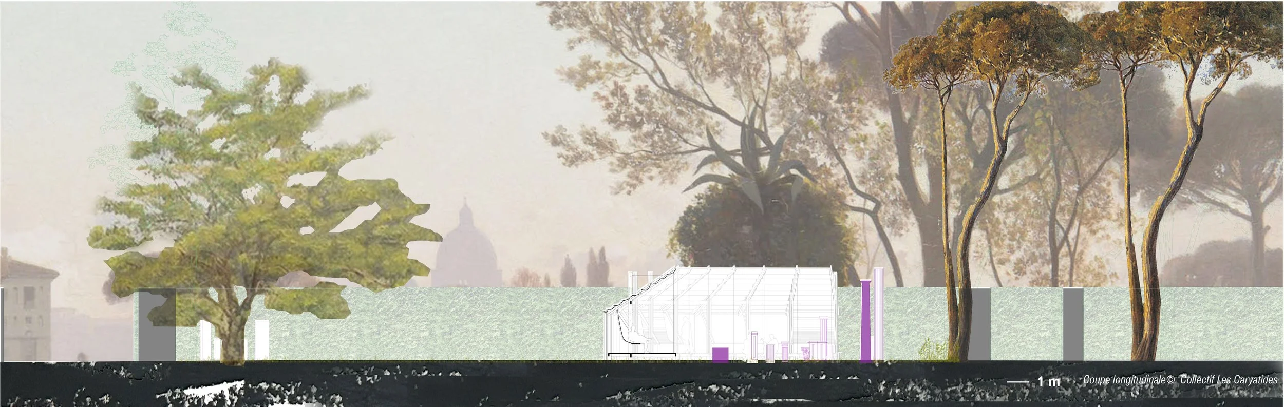 La cabane consiste en la création d’un abri, sous la forme d’un demi-cercle en plan, reprenant ainsi les géométries structurant le Jardin, qui permette l’encadrement et la mise en valeur de ces vestiges. La cabane, tenant les vestiges, permet de les mettre au centre de l’attention et de créer une intimité, une proximité avec les éléments sculpturaux présents et parfois oubliés dans le carré des vestiges dans son entièreté.